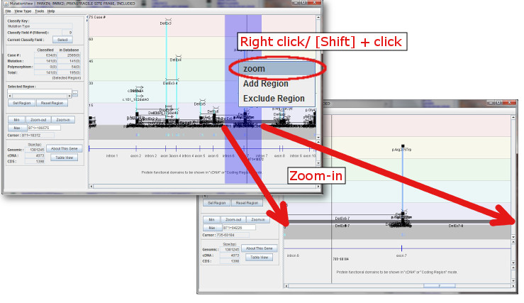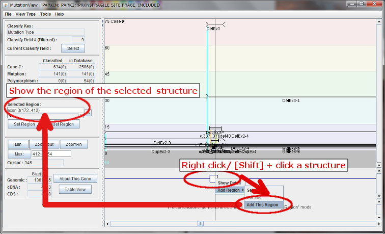 - Selecting a region: By right clicking a structure, such as exon, intron, domain, or dragged region, a pull-down menu is shown. By clicking [Add Region] in the pull-down menu, the selected region is shown in the [Selected Region] field.