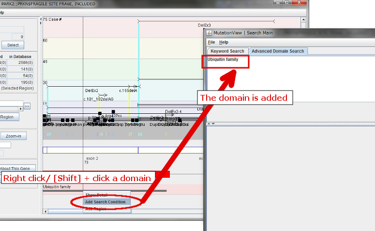 By right clicking or clicking while pressing [Shift], some domains in Gene Structure Window, a pull-down menu is displayed. You can add the selected domain as a retrieval key in the search window by clicking the [Add Search Condition] button in the pull-down menu.