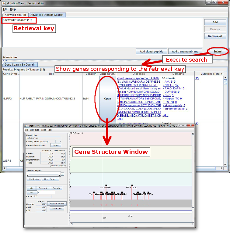 Gene Structure Window displays genetic variations with graphical images of gene structures, base sequences and symptoms.