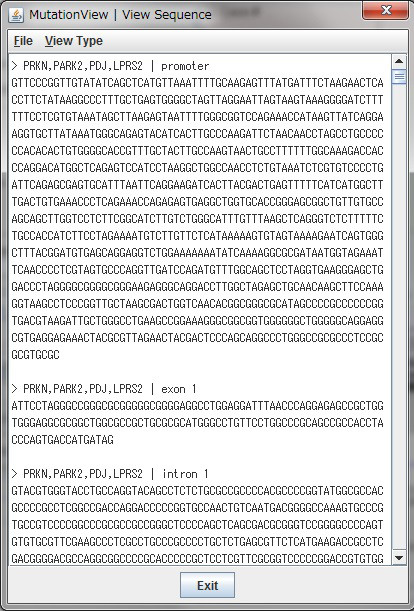 - View sequence: By clicking [View Sequence] in the menu [Tools], View Sequence window is opened. View Sequence window shows base sequences of each structure, such as exon, intron, and cDNA.