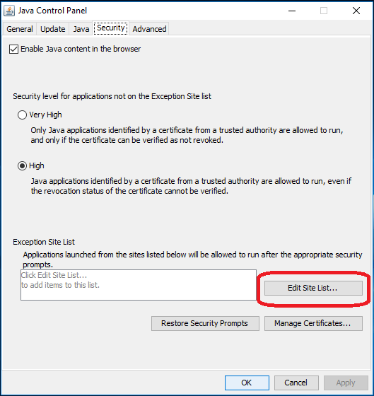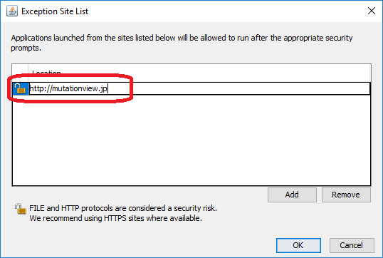 If the application block error is displayed when you accessed MutationView top page, you can avoid the error by setting the exception site list in the Java Control Panel.